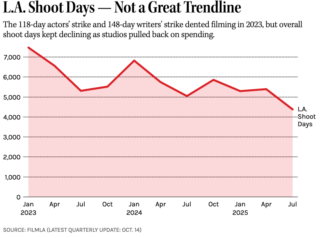 The state of film and television production in Los Angeles has sunk to another all-time low. Earlier this week, the non-profit industry group FilmLA released a report claiming that in the quarter from July to September, the Los Angeles area registered the fewest number of film & television production days in history.