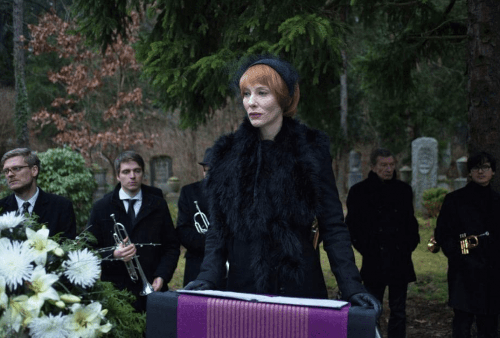 Blanchett co-starred with Alicia Vikander in the German-Canadian black comedy, Rumours (2024), co-written and co-directed by Guy Maddin, Evan Johnson, and Galen Johnson, with Charles Dance, Roy Dupuis, and Nikki Amuka-Bird, and premiering at the Cannes Film Festival.