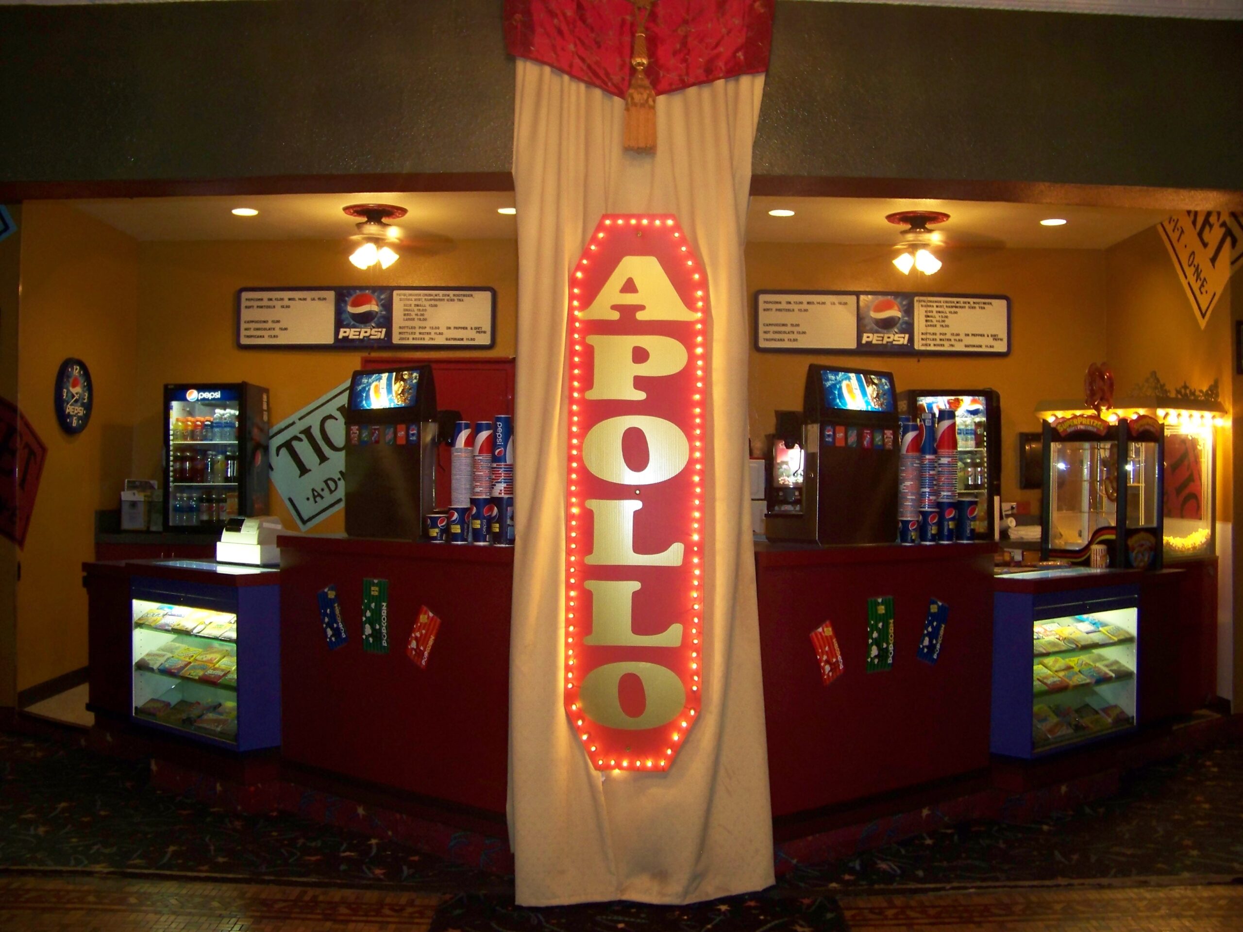 Apollo Theatre is a family-owned and operated movie theater. The theater features snack and food concessions at standard movie theater prices. The theater opens 30 minutes prior to the first showtime and closes 15 minutes after the last showtime.