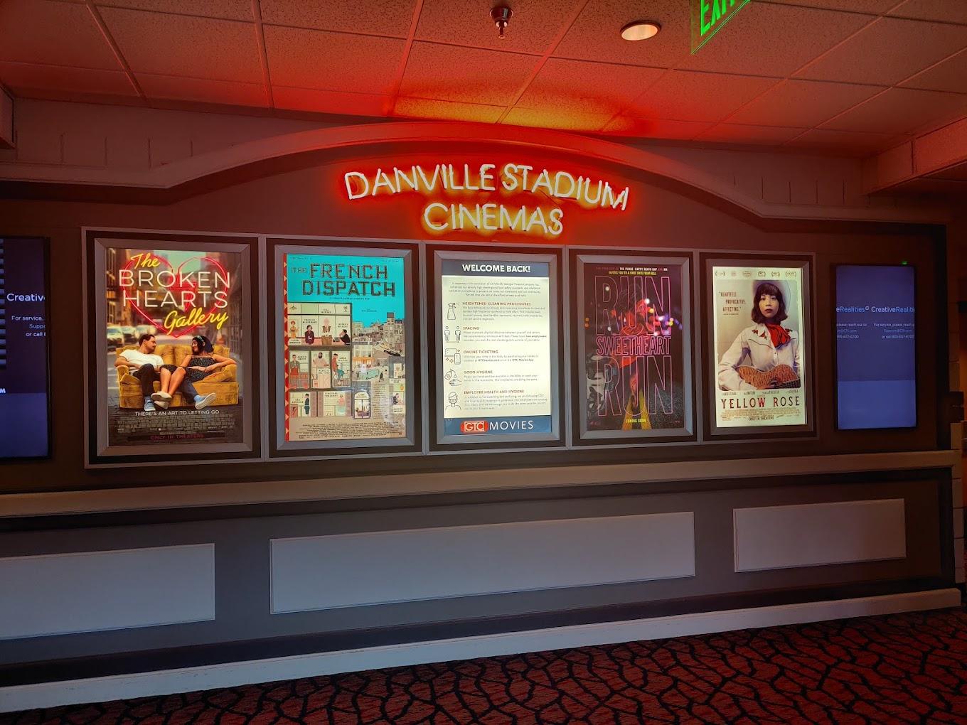 GTC Danville Cinemas is a 12-screen movie theater located in Danville, Virginia. The theater offers modern amenities such as handicapped access, assisted listening and ticket kiosks in the lobby.