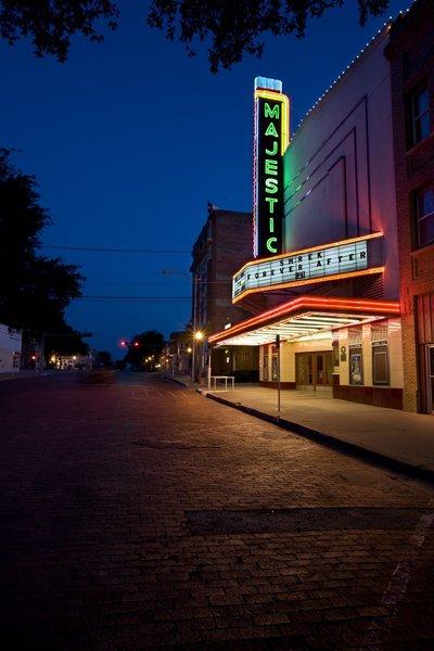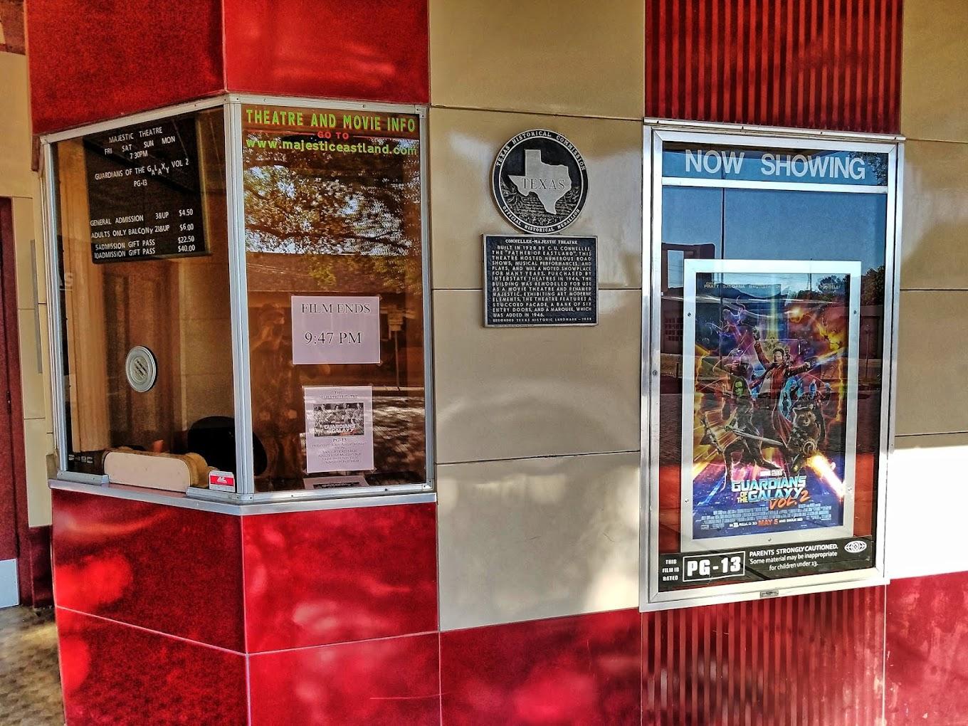 The Majestic Theatre is a historical movie house located at 108 North Lamar Street in Eastland, Texas. The theater plays first-run Hollywood movies every Friday, Saturday, Sunday and Monday nights with doors opening at 6:15 and the movie starting at 7:00. Our service is friendly and our prices are affordable. Come enjoy a lovely night at the movies.